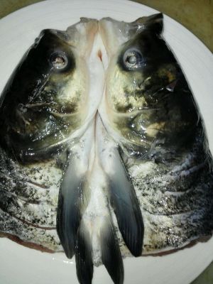 鱼头去鳃,洗净后从一侧剖开,沥干水分后用一勺料酒,一勺蚝油,一勺蒸鱼豉油和少许白胡椒粉的混合物均匀涂抹。