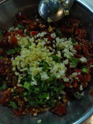 鱼头酱乘婉里,放入适量的姜末,蒜末,葱花,味精。