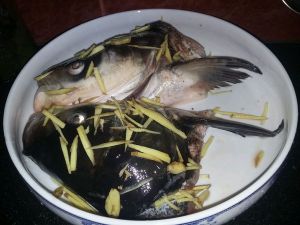 鱼头洗干净抹些料酒,姜切成丝,盘子铺一会,鱼头上面铺一层。