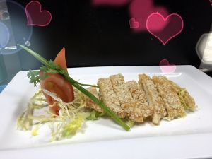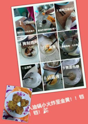 这是刚刚的两块鸡胸,片开后,在鸡肉表层撒盐(适量),胡椒粉(适量),放少许料酒,去腥味。用刀背,或刀尖,将肉捶打一下,炸出后更松软