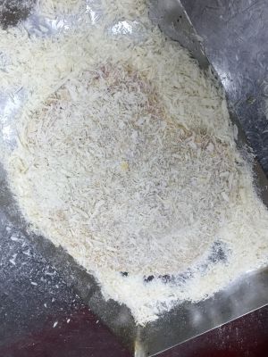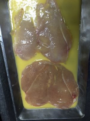准备淀粉、鸡蛋液、面包糠,按这个顺序让腌制好的鸡胸肉一次沾匀。