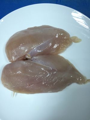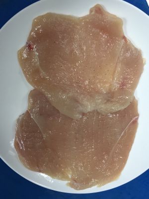 首先,化好的鸡胸肉切成2CM左右的片,用刀背拍松