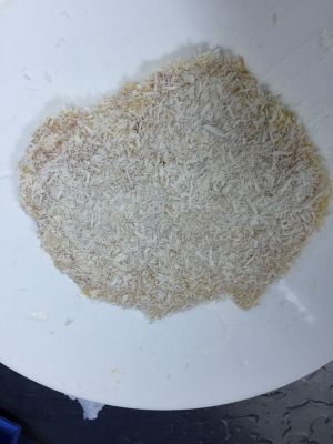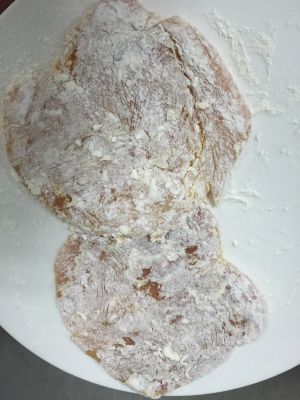捶打好后,先裹面粉,均匀地一层就好,不需要特别厚