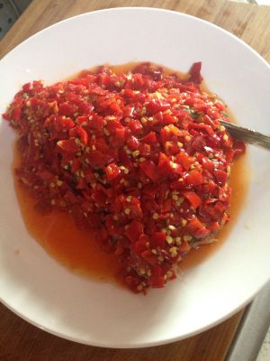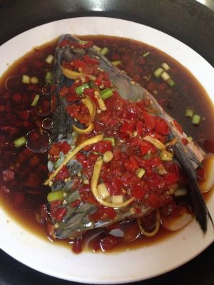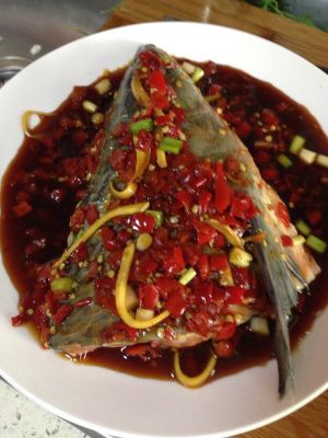 将鱼头取出,换另一个盘子,之前里面的姜啊葱啊剁椒啊,统统不要,重新铺一层剁椒