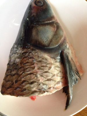 首先,把鱼头洗干净分两半,因为碗小了,我只能做半边(但是半个完全不够吃呀,呵呵