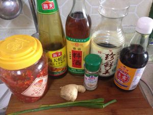 然后把图中所有的材料倒在碗里,量的话生抽多一点,料酒、耗油、胡椒、剁椒、鱼露、葱白切段、姜切丝。