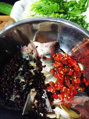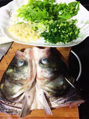 首先把鱼头切成两半 均匀涂抹盐 料酒 鸡精 胡椒粉 二十分钟左右