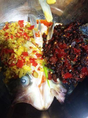 美人椒、姜、蒜,一起切成末。锅里放油暴香美人椒姜蒜末,然后加入剁椒,加入生抽、蒸鱼豉油、蚝油、白糖,翻炒均匀。 盘子底部垫一些姜片,然后垫上大葱,让鱼跟盘子之间留有空隙,这样易于熟,表面铺上处理好的混合剁椒