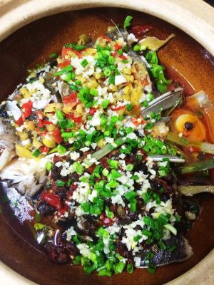撒上大蒜葱末 最后锅里烧一小碗油 淋在鱼头上面