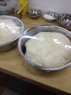 家里吃饭的碗大概三碗面,发孝粉给新手个量,普通矿泉水瓶盖三分之一。加温热的水,筷子搅拌,等面粉粘连成旭状就差不多了,标准就是面既软又不粘面盆,揉好后醒5分钟,然后放温暖的地方发孝20到40分钟。