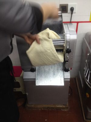 将面团拿出压面,压面是个体力活,我是从来不想用手去揉,压至面团发白,不回缩,摊到案板上