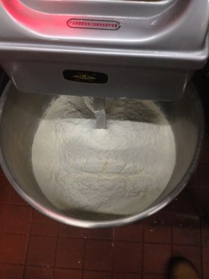 称好材料,全部混合到一起,倒入搅拌机,干搅几分钟,把材料和面粉搅匀称。再加入水搅拌,如果用手和面,用粉筛筛匀最好
