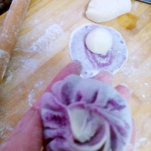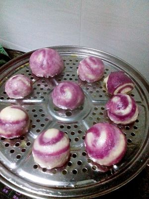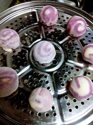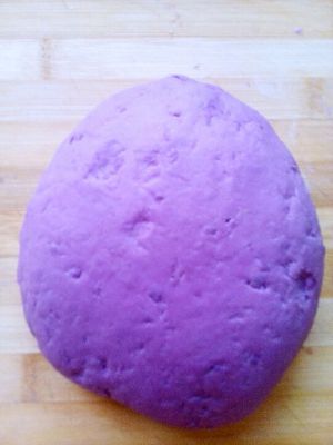 将紫薯洗净去皮,后切片蒸10分钟左右。将蒸好的紫薯趁热,捣成泥。紫薯泥中,加入面粉150g,适量白糖,用温水调好适量酵母粉,揉至成光滑面团。醒40分钟,发至原来面团的两倍大。