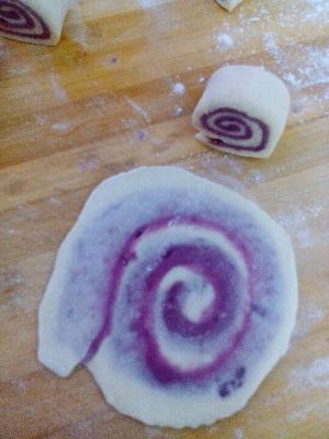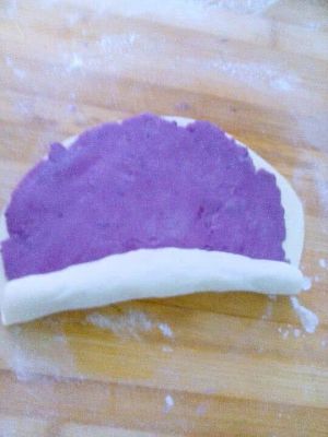 将面团分别分成小块, 擀成薄的面皮后, 白色的放在下面, 上面用小汤勺抹上一小层水, 在铺上紫薯面,上面也加上少量的水, 从一边开始卷起。