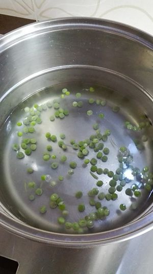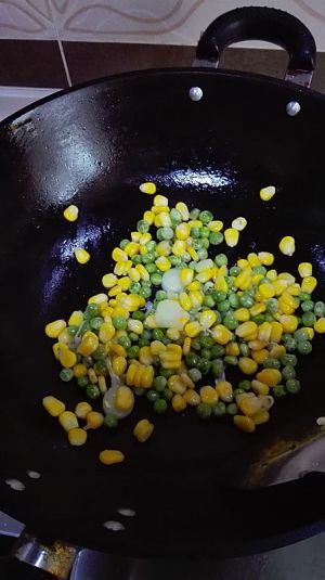 炒锅入油,放入葱花炒出香味,放入焯水后的青豆和甜玉米粒翻炒;