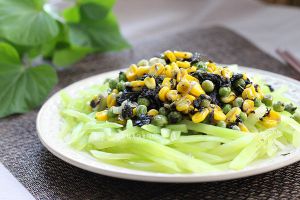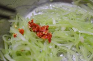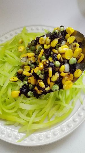 把炒匀的蔬菜放到莴笋丝上面,像意面一样;