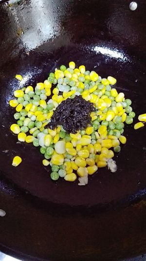 青豆、玉米粒都是熟的,稍微翻炒即可,放入橄榄菜翻炒均匀,