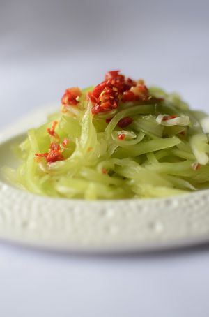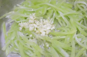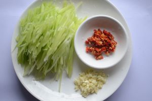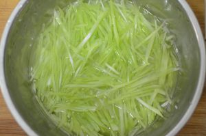 然后倒入莴笋丝中,再滴入几滴香油,用筷子拌匀即可