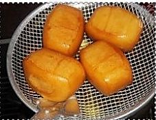 炸至馒头变了金黄色,筷子碰上去,感觉到酥脆就可以捞起沥干油;