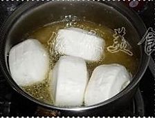 小奶锅里放油,烧至5成热;把馒头放下去,开中火炸,要不断翻身,开始会一直浮上来,需要用筷子把馒头压下去,最好先炸有切口的那面;
