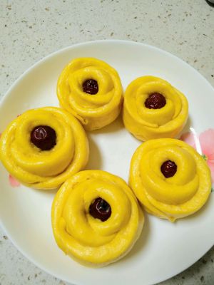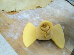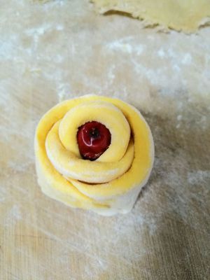 将发好的面,擀成圆片,切十字花刀,将枣放在中间,进行花包。