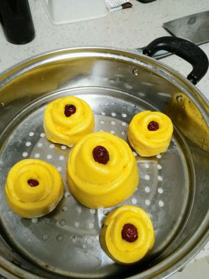 将南瓜蒸熟,捣成细泥儿,与面粉一起加温水和,进行发面。