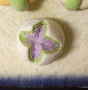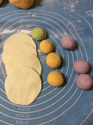 白色面团揉圆压扁,铺上红枣碎,拿一个包好的黄色团子,继续用包包子的方式包起来