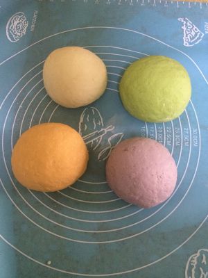 四种面团,白面团200克做一个,其它三种100克做一个,面团按照每一百克加一克酵母比例做面团,蔬菜汁和面时要根据自己做的面团的量比例和面,和的面团要偏硬一点,做出来的馒头才能有形才漂亮。(冬天发面需要三十几度的温水发面,揉好面团盖上保鲜膜盖上毛巾,大约三至四个小时发好,夏天发面需要冰水发面比较好,蔬菜汁我放冰箱冷藏后使用,发出来的面团效果非常好。