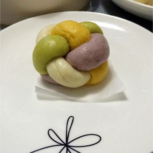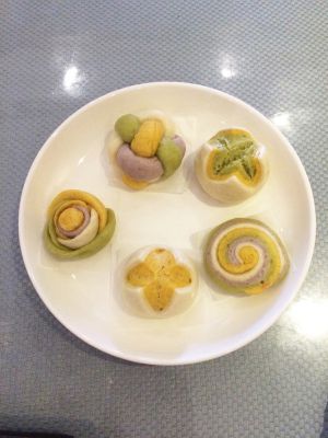 简单说一下彩虹馒头,四种面团擀成薄厚一致的长方形,卷起切成小段,开水蒸15分钟。