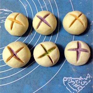 在馒头中间用刀划一个十字架,划到一个馒头的一个平面的直径,不要划太长,深度划露出三色即可,不能太深,划的步骤很重要,一个开花馒头好不好看就在这两刀,切记!