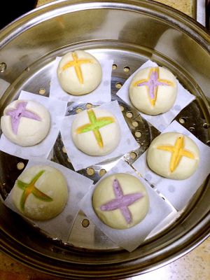 划开一两分钟后花自然慢慢开了,上蒸笼前在馒头下垫上油纸或者纱布,也可以微微刷点色拉油,防止蒸好后有水蒸汽取出粘连,开水上锅蒸约15至20钟,馒头就完全熟透,可以立刻取出,刚取出的馒头不要拥挤或者重叠在一起,容易粘连。