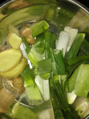 开水煮排骨!去除血沫!在此期间准备配料!葱姜蒜!煮过的骨头汤保留