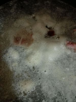 加入葱姜蒜,料酒,下锅抄一下排骨,加热后把浮上来的泡沫撇掉