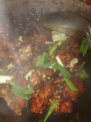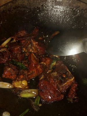 大火烧开后!放入葱姜蒜!料酒!老抽!然后就是最后的收汁了!中火转小火!大概40分钟到一个小时!所以收汁建议用另外的锅!这段时间你就可以做其他的菜了!