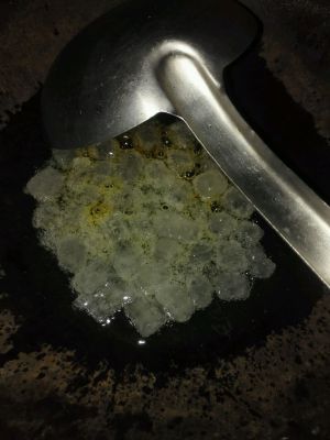 热锅少量冷油,下敲碎的冰糖,小火加热至冰糖融化颜色变褐色,冒泡!