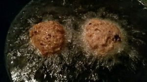 放入肉丸子,开始油温高些便于成型,慢慢炸制油的泡沫变小。