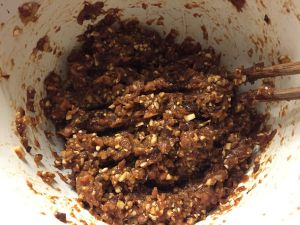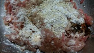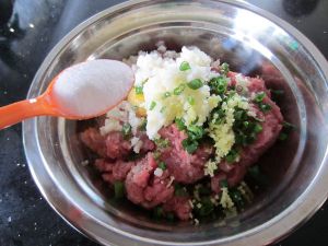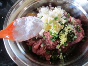 将生粉、盐、白芝麻、香料粉放入肉馅中