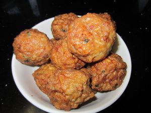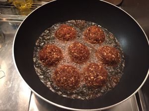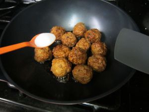 将肉馅用汤匙和小汤匙相互团转成球状,下入油温在160°c_180°c之间,炸至外皮焦黄
