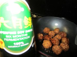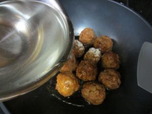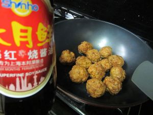 锅中放少许油,将姜片和八角爆香后,下炸好的肉圆。