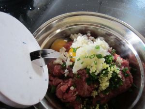 肉馅放上鸡蛋、葱姜、盐、花椒水。