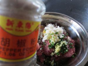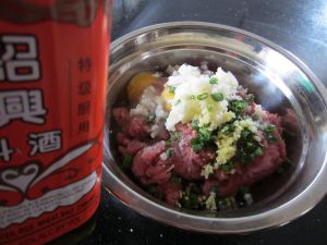 肉和马蹄剁好了放到大碗里,下一个鸡蛋,一点盐和酱油,顺一个方向搅上劲