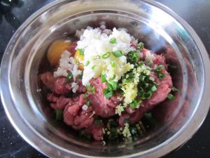 猪肉剁碎后,加入鸡蛋、荸荠、土司屑、葱姜末。