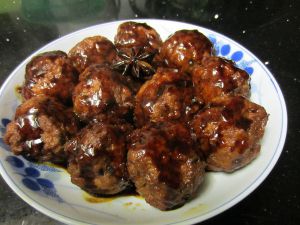捞出炸好的丸子,放入锅内,加热水,放入花椒、大料、小茴香、葱姜,酱油、白糖、胡椒粉、盐大火烧开,转小火慢慢炖煮入味。