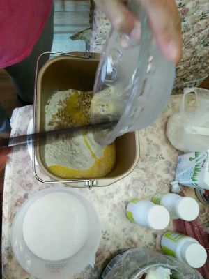 将所有材料倒入面包机,开动发面程序。搅拌20分钟发面10分钟,让面包机第二次搅拌排出气。