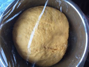 酵母和白糖用接近体温的水溶化,和面成面团,表面抹少许油,用保鲜膜盖好,醒发