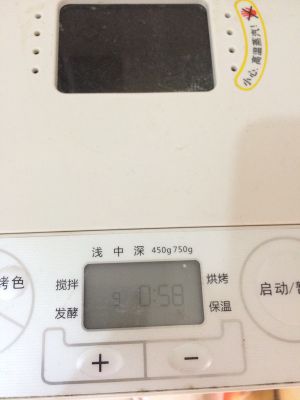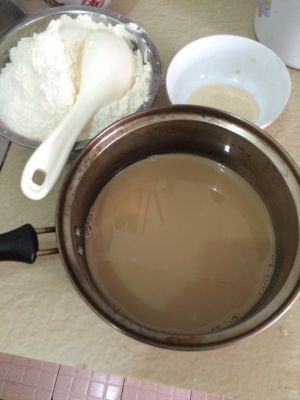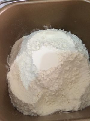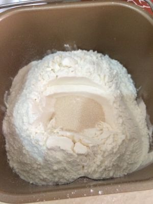 然后把煮好的牛奶红糖水倒入面包机,放入面粉,酵母。(注意放酵母一定要在面粉中间放在一个凹坑里边,牛奶红糖水一定要放凉,要不然太烫会把酵母烫死,就发不了面了。)