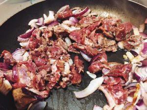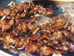 锅中放入30g油(约两汤匙),下牛肉片炒至牛肉熟,下青红椒片和洋葱片,炒1分钟;