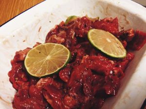 牛肉切片,斜着下刀,尽可能薄一些,用刀背或刀把敲打肉片,把经络敲松,肉质会更滑嫩。接着用料酒和淀粉上浆,蚝油,盐,黑胡椒和几片青柠檬腌制一晚