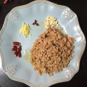 肉剁成肉末,只放一丁点盐调个底味。姜蒜切成碎粒,干辣椒切成段