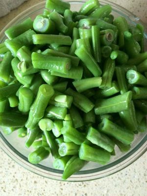 将豆角切成小段,用水焯一下,水里放少许油,以保持豆角翠绿的颜色,捞出备用